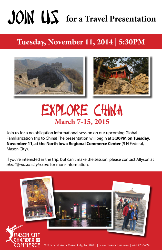 Although China is our largest overseas trading partner, much of this country is a mystery to Americans. This value-priced tour includes visits to seven of the Top Ten tourist attractions in China and provides the opportunity to experience the history, culture, and traditions firsthand. Join the Chamber on the 9-day journey to China March 7-15, 2015.