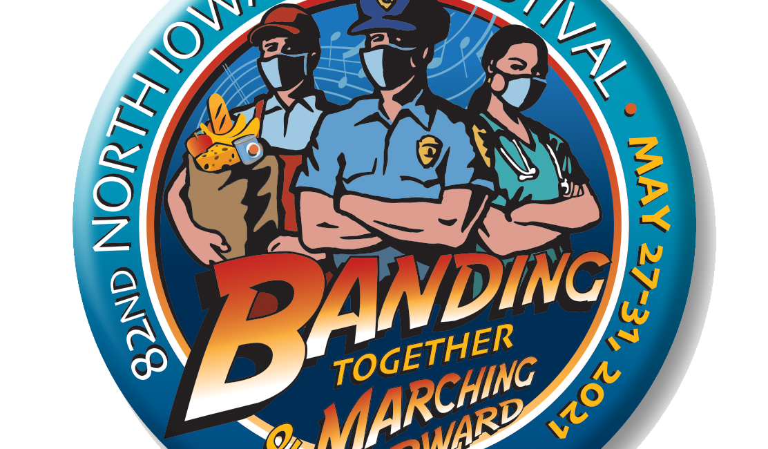 The committee is busy planning the 82nd North Iowa Band Festival, with some adjustments and some tentative scheduling. The festival theme reflects our challenging times: Banding Together and Marching Forward. Longtime committee member and local artist Jim Zach eagerly took on the challenge to quickly design a new logo for the festival—and captured the spirit perfectly!